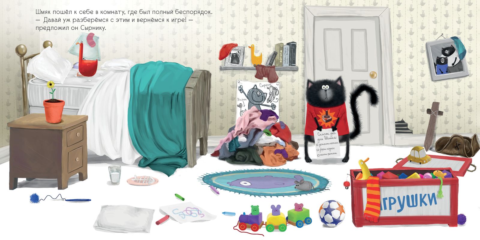 Как приучить малыша помогать по дому? Папа котенка Шмяка знает один секрет! На семейном совете было решено, что теперь у Шмяка будет свой список домашних дел. Но… убирать игрушки, застилать постель, поливать цветы — это целая вечность пройдет! «Когда тебе весело, время летит незаметно», — подсказывает папа Шмяку. Убирая игрушки в ящик, Шмяк представил, будто нашел пиратский клад на необитаемом острове, и теперь ему надо сложить все золотые монеты в сундук. Кто бы мог подумать, что уборка может быть такой веселой!