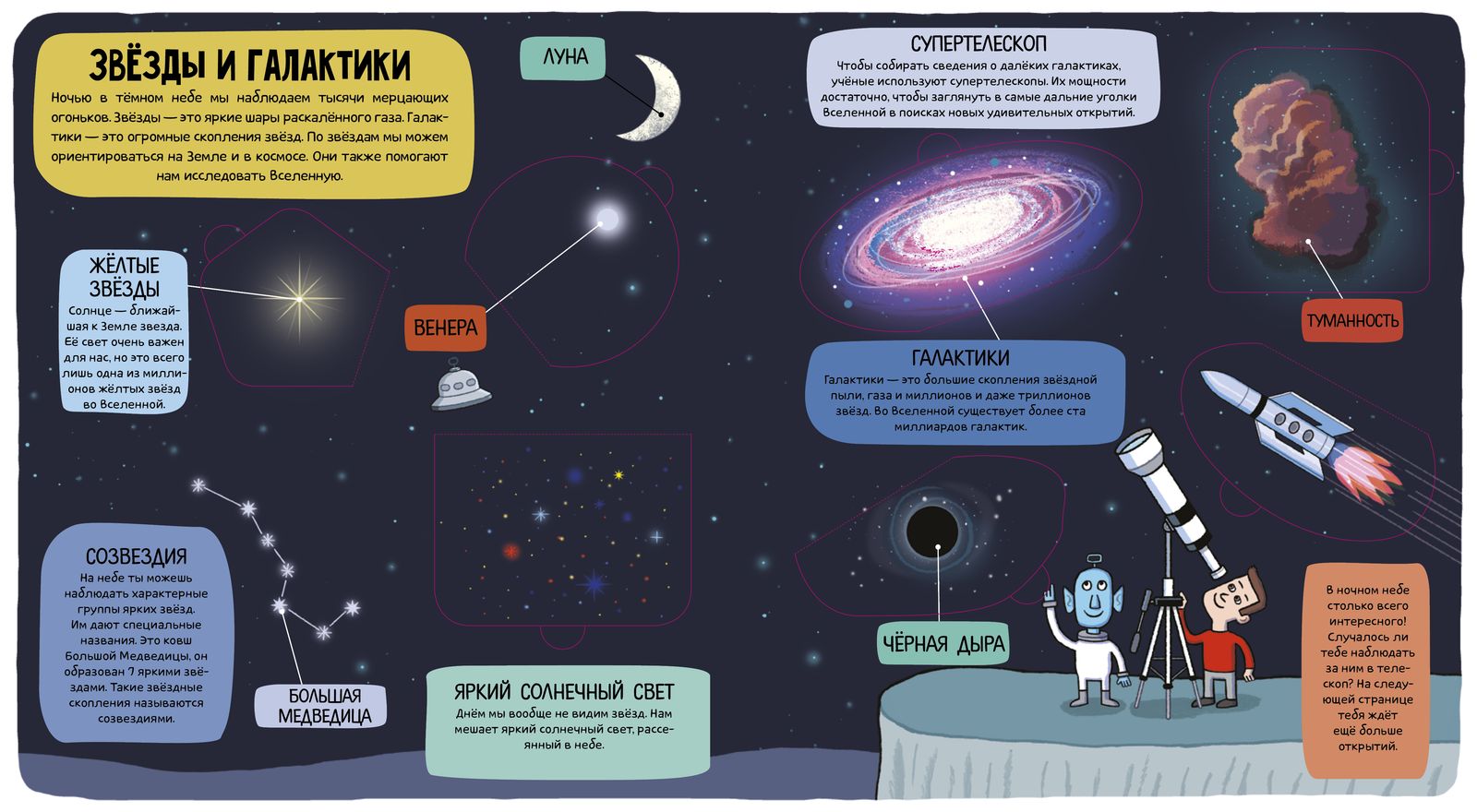 Как космонавты попадают в космос? Почему они в скафандрах? А кто первым полетел на Луну? А почему Солнце горячее? А что внутри у планет? На все вопросы маленького «почемучки» есть ответы в этой книге. На каждом развороте подробный и очень понятный рассказ о разных планетах, о смелых космонавтах, которые покоряли космос, и даже об инопланетянах, милых и симпатичных. Хочешь узнать, кто провалился в Черную дыру? Открой окошко и все увидишь.