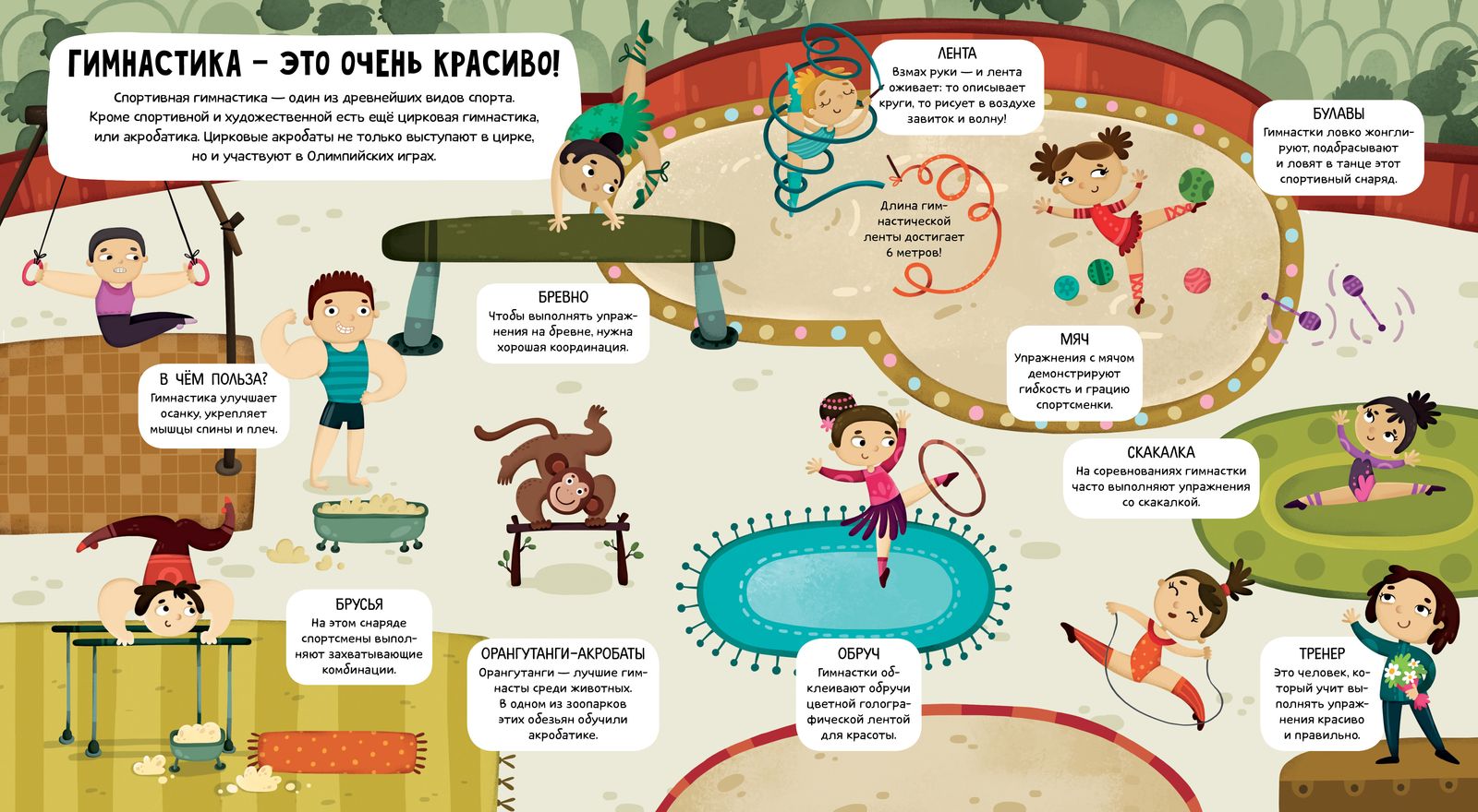 Юные читатели узнают все о бейсболе, плавании, гимнастике, футболе, теннисе, лыжах и родео. Какой из видов спорта самый безопасный? В какой стране придумали футбол? Какие животные участвуют в родео? Эти и другие интересные факты ждут вас в этой яркой книжке!
