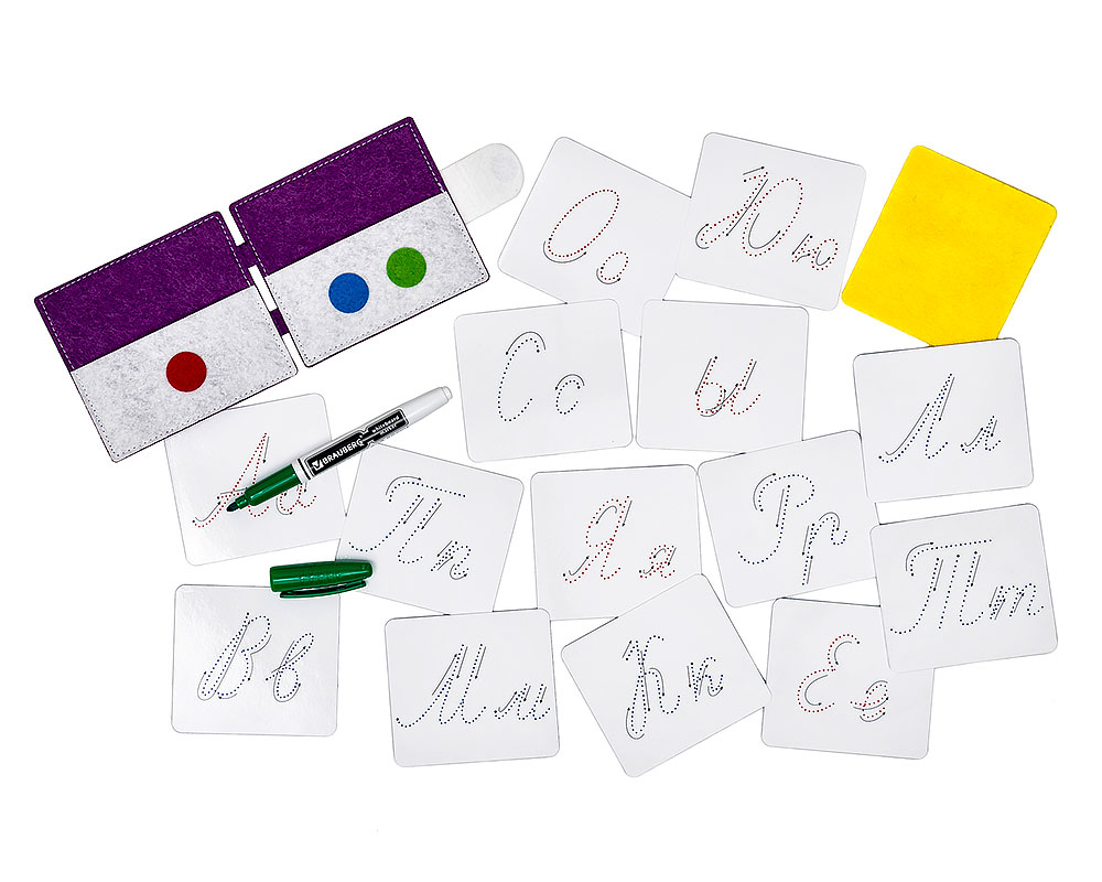 2. Выберите карточку с любой знакомой ребенку буквой. Объясните ребенку, когда используется большая буква (заглавная), а когда маленькая. Покажите, как обвести буквы пальчиком. Попросите ребенка повторить ваше движение. Предложите нарисовать буквы с помощью маркера. Покажите ребенку, как легко стереть буквы с карточки с помощью салфетки.