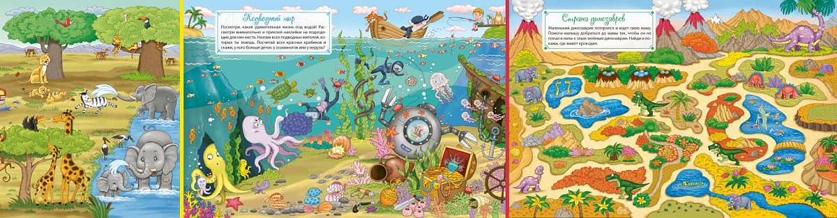 - Крупные и яркие иллюстрации, большое количество многоразовых виниловых наклеек на прозрачной пленке.