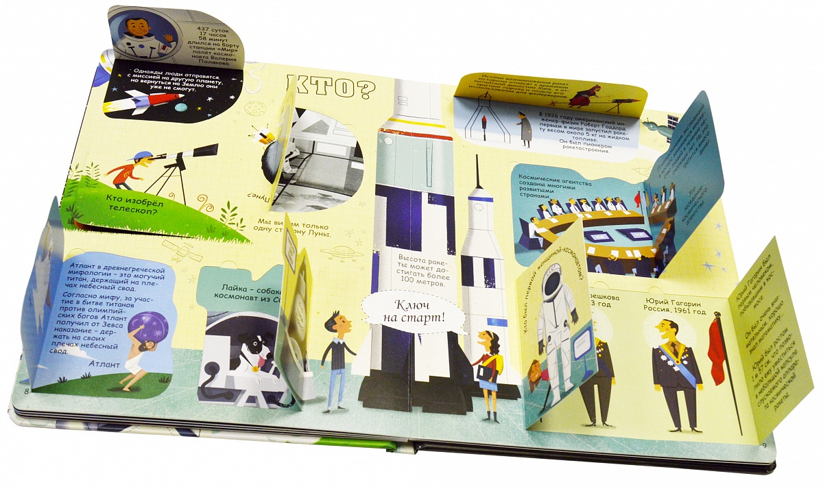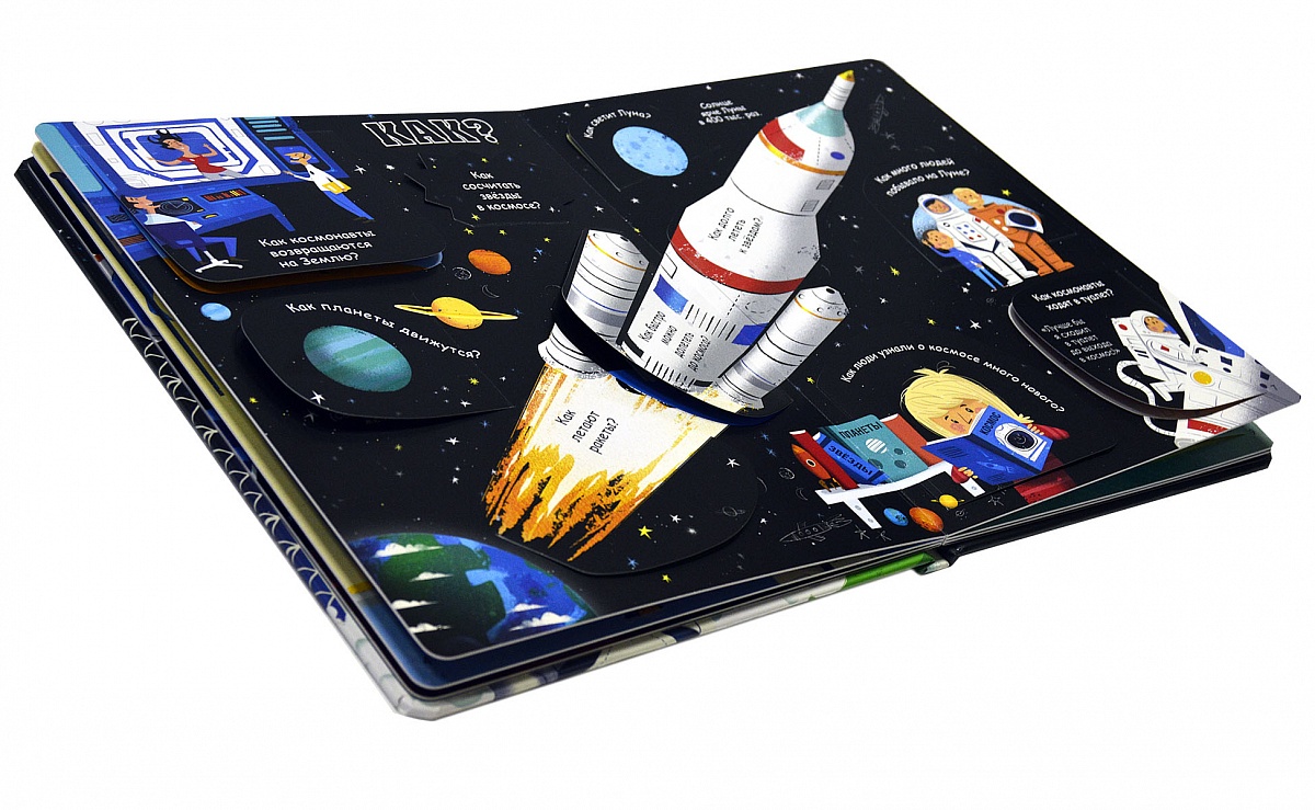 Загляни под каждую створку - и ты найдёшь ответы на разнообразные вопросы о планетах, звездах и галактиках, а также узнаешь: что, где, когда, почему, правда или нет. Более 60 окошек - за каждым из них скрываются любопытные факты о космосе.