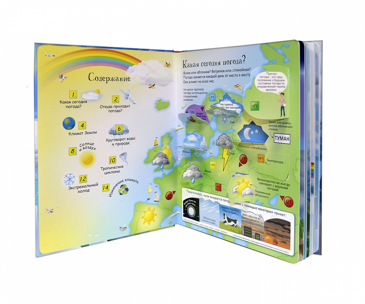 - Яркие и детальные иллюстрации, а также более 100 створок, за которыми прячутся факты о погоде и климате.