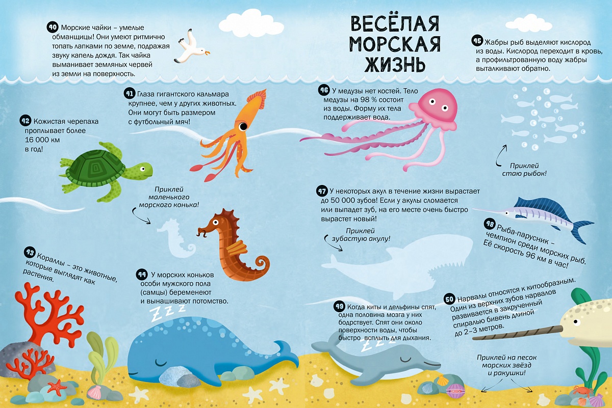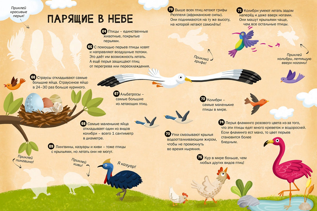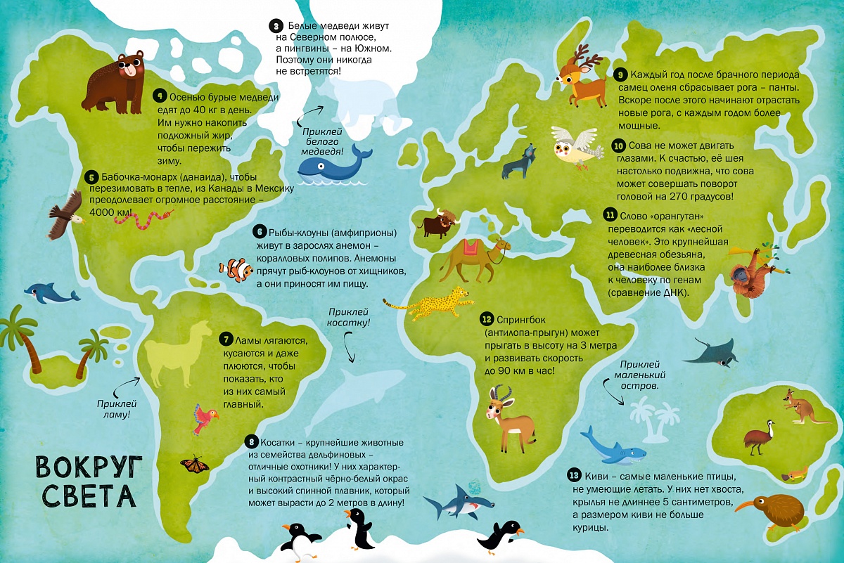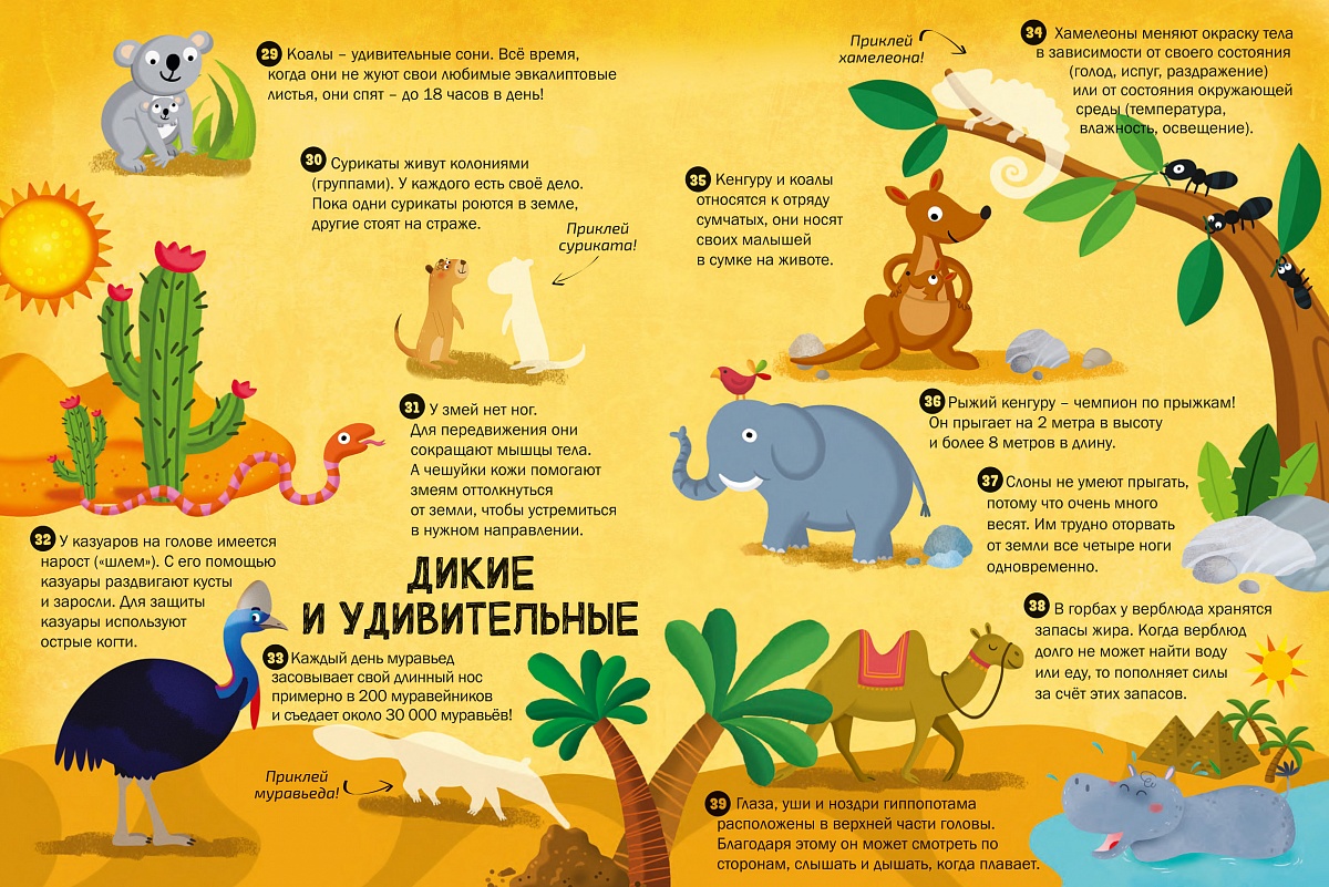 Открой для себя много удивительных фактов о животных в этой книге с наклейками. Найди наклейки к этим интересным сведениям, исследуй мир животных и соверши удивительное приключение.