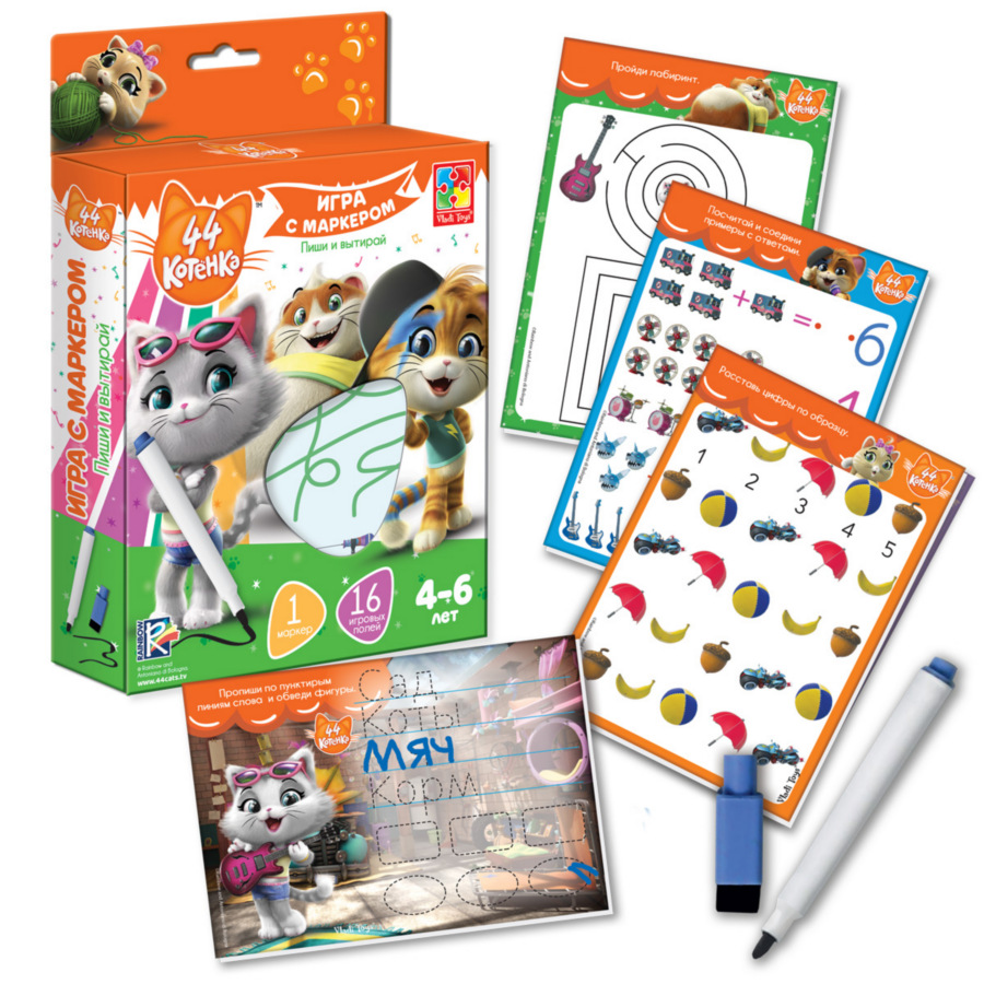Игра с маркером из серии «44 Котенка» понравится деткам красочным оформлением с изображением героев мультика на полях. Вместе с любимыми персонажами ребенок будет рисовать, писать, блуждать по лабиринтам, сравнивать картинки и выполнять другие увлекательные задания.