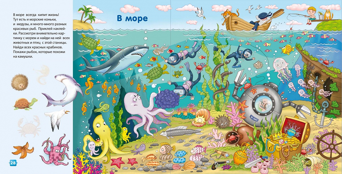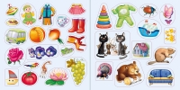 - Интерактивное пособие с яркими, крупными иллюстрациями природы, животных, первых предметов и большим количеством наклеек.