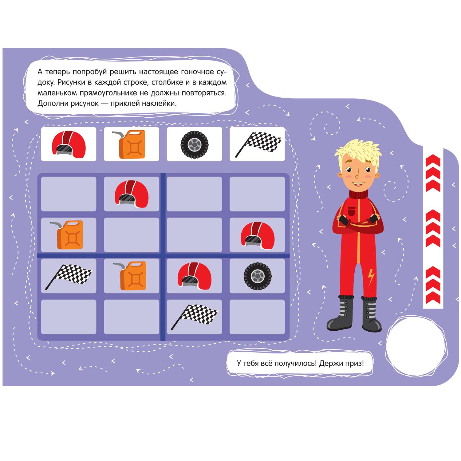 Эта красочная книжка-активити с наклейками приведет в восторг любого мальчика. На ее страницах можно встретить быстрого автогонщика - и совершить увлекательное путешествие, полное загадок и головоломок.
