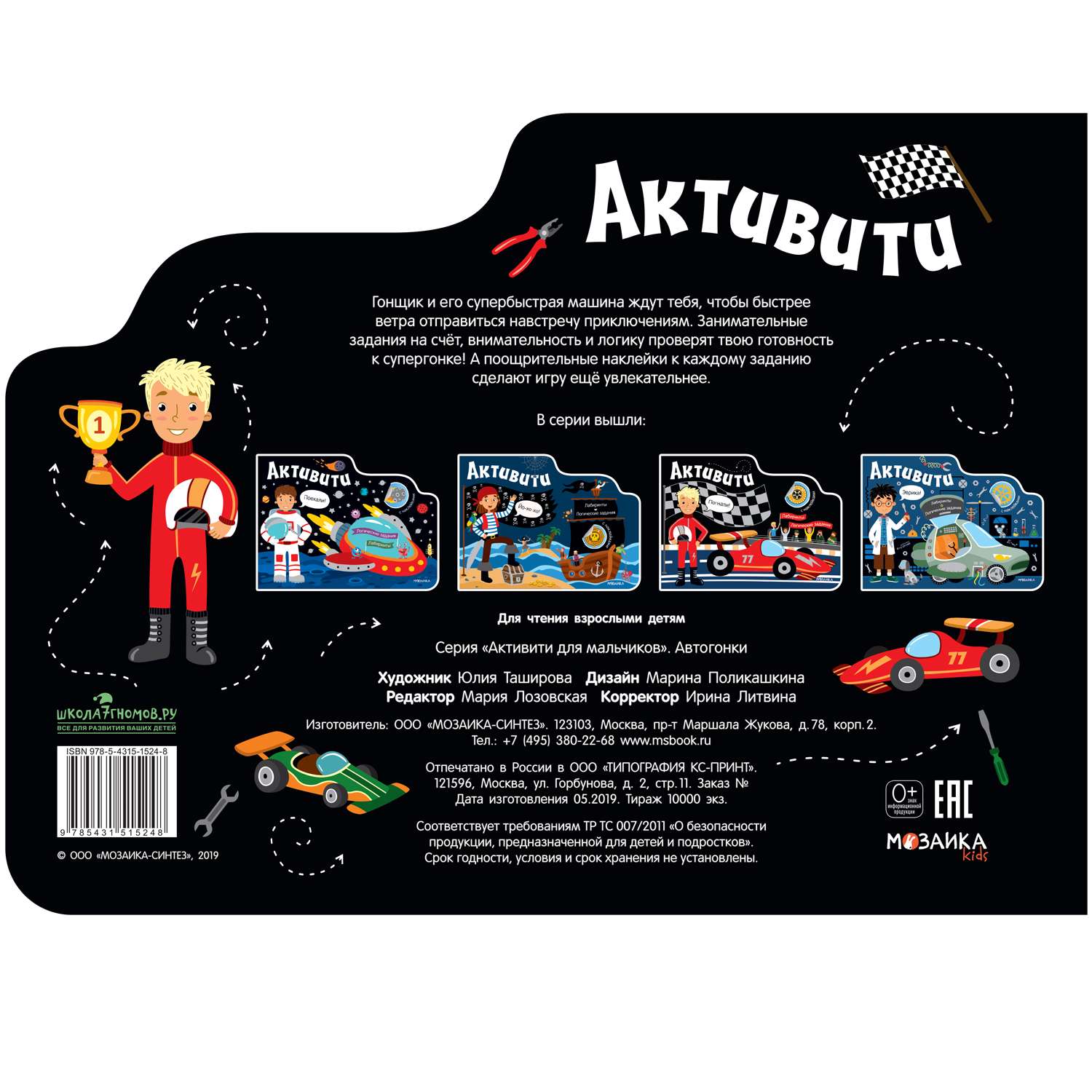Книга «Автогонки» из серии «Активити для мальчиков» поможет весело и с пользой провести время где угодно: дома, в гостях, поездке и на прогулке. Занятия по ней способствуют развитию мелкой моторики, логического мышления, внимания и памяти.