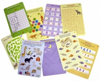 В набор входит 50 двусторонних многоразовых карточек с заданиями на сообразительность: логическими задачками и головоломками, играми на внимание, память, воображение, кроссвордами и лабиринтами, задачками на счёт, чтение и письмо, а также интересными заданиями для рисования.
