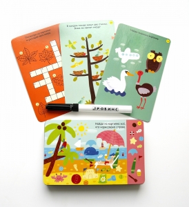 - 50 двусторонних многоразовых карточек, карточки с ответами и маркер на водной основе для работы с набором.