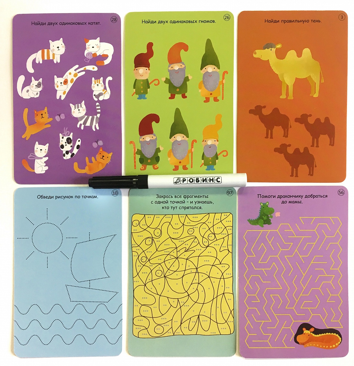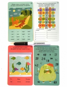 - 50 двусторонних многоразовых карточек, карточки с ответами и маркер на водной основе для работы с набором.