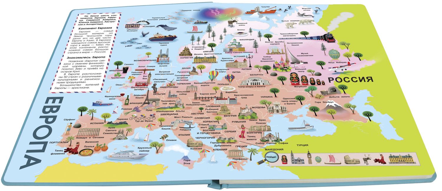 Издание поможет развить любознательность, узнать и запомнить много нового и интересного, станет замечательным подарком для Вашего ребёнка. Открывая атлас на любой странице, вы вместе с ним тут же отправляетесь в увлекательное и интересное путешествие по нашей планете!