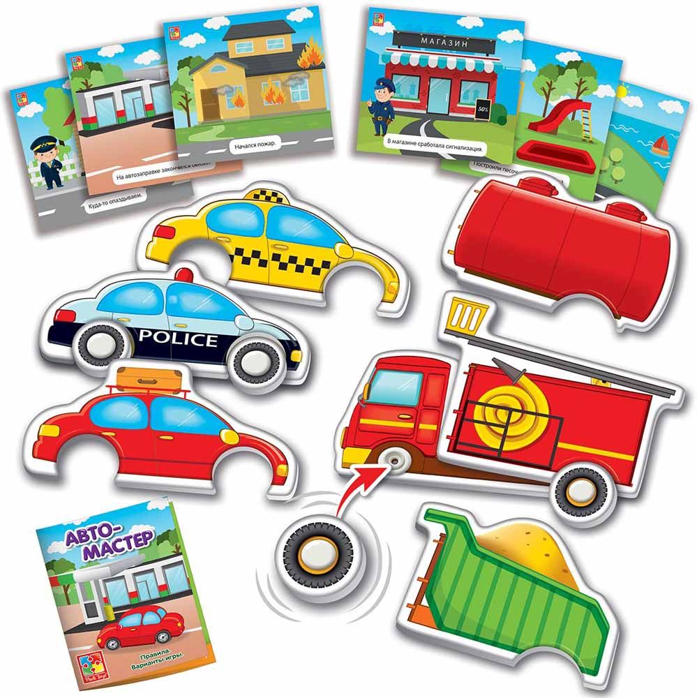Благодаря игре «Автомастер» от компании «Vladi Toys» любознательные исследователи окружающего мира научатся безошибочно определять вид машины, сможет рассказать о ее назначении и отличительных особенностях. Машинки, которые ребенок будет собирать в процессе игры, имеют подвижные элементы на кнопках и липучках.