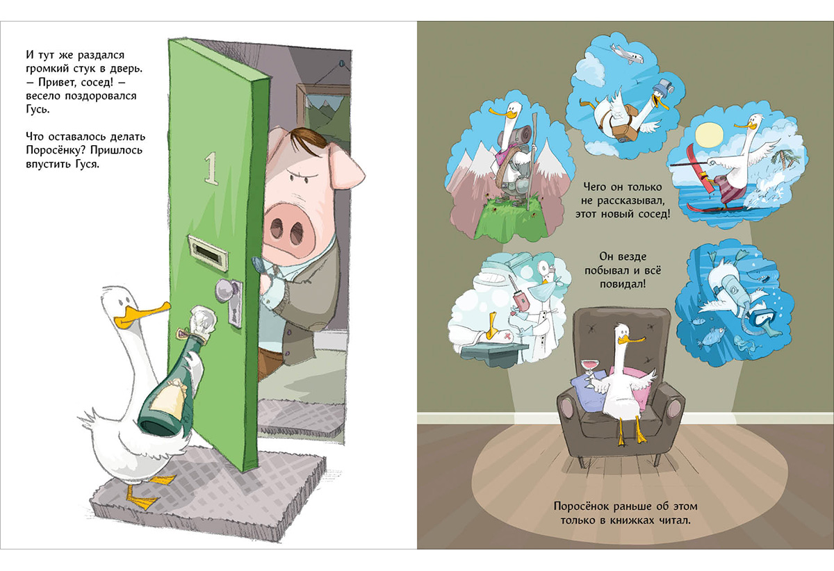 Поросёнок живёт один на высоком холме. Ему нравится печь пироги, читать книжки и собирать пазлы. А больше всего на свете он любит свой уютный дом и чудесный вид из окна. Точнее... ЛЮБИЛ. До тех пор, пока на соседнем холме не поселился этот шумный, навязчивый Гусь! Его послушать - так он везде побывал и всё повидал, даже те места, о которых Поросёнок только в книжках читал. Он просто ужасный сосед! Но без него немного? как бы сказать? даже странно, но БЕЗ НЕГО скучно!