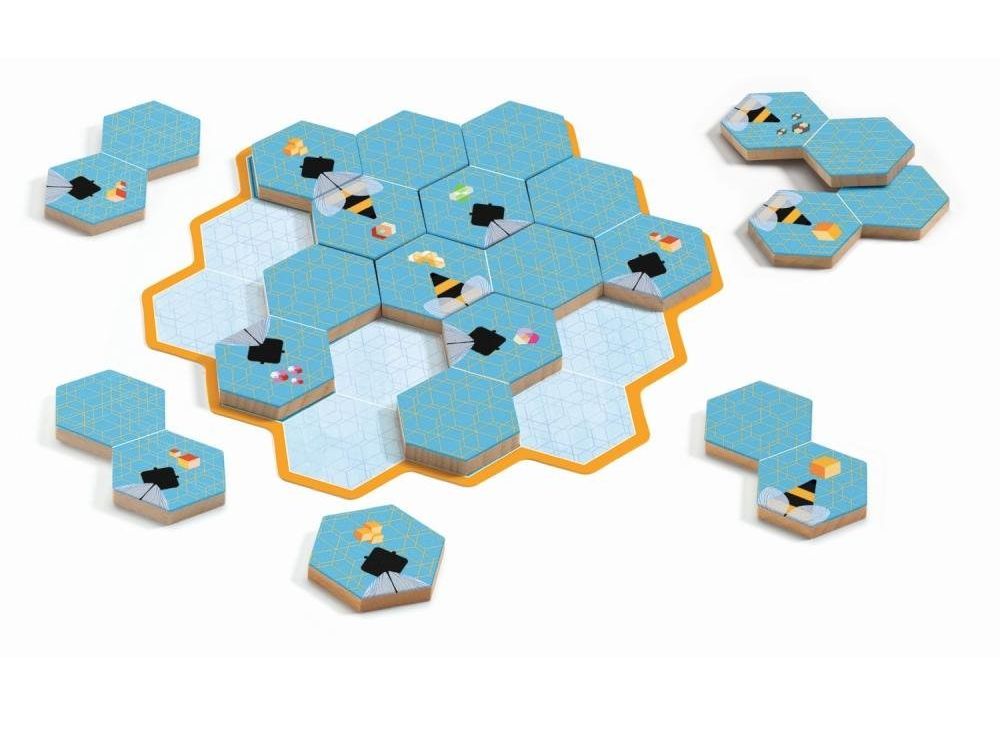 - Настольная игра головоломка представлена деревянными деталями, выполненными в форме пчелиных сот и карточками с заданиями, которые ребенку предлагается выполнить.