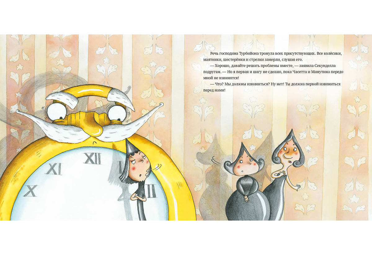 Часетта, Минутина, Секунделла - часовые стрелки. Они работают у важного и строгого господина Турбийона, следящего за точным ходом карманных часов. Каждый день подружки выполняют одну и ту же работу. И однажды часовые стрелки поссорились и? разбежались в разные стороны. Что же не поделили между собой подружки?