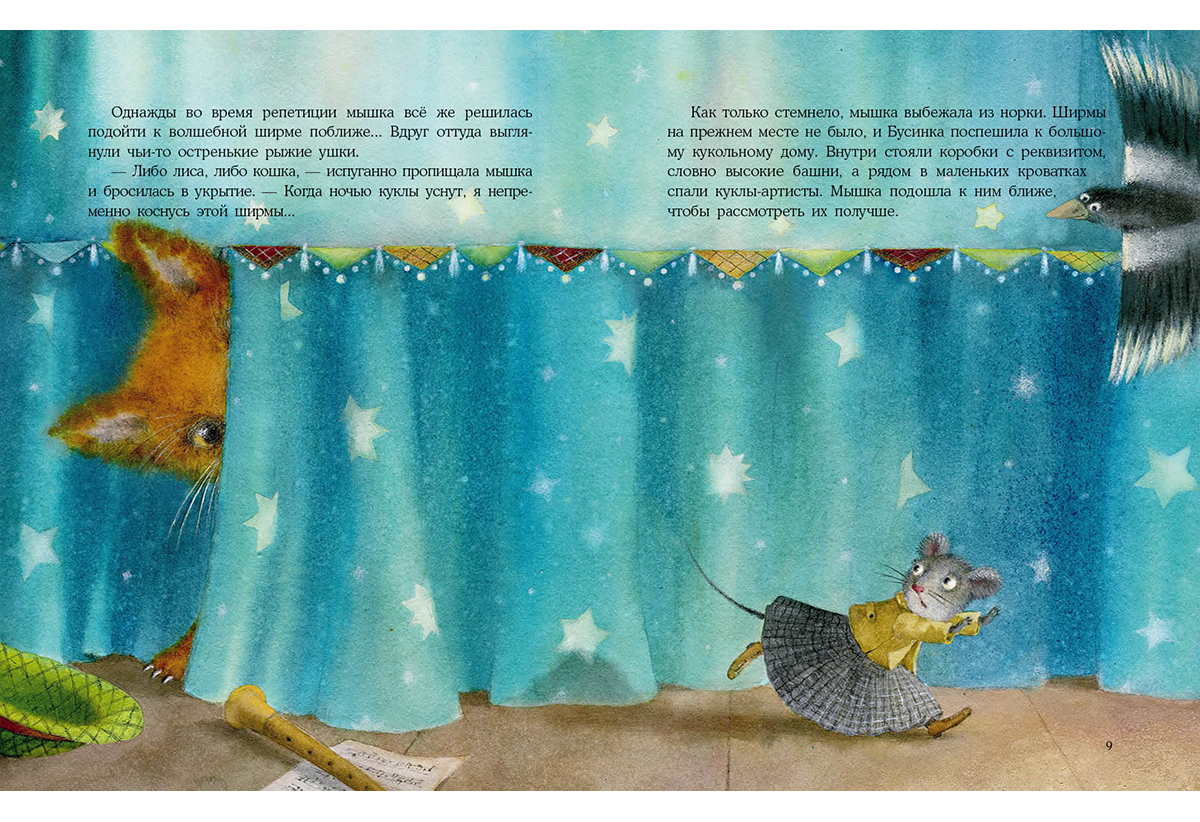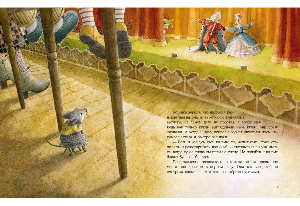 В театре кукол жила маленькая мышка по имени Бусинка. Она с удовольствием смотрела все спектакли и знала всех кукол по именам. Бусинка мечтала стать настоящей артисткой! Мышка представляла себя в золотом сверкающем платье, красных туфельках и с короной на голове. И однажды она услышала, что на главную роль срочно нужна артистка?