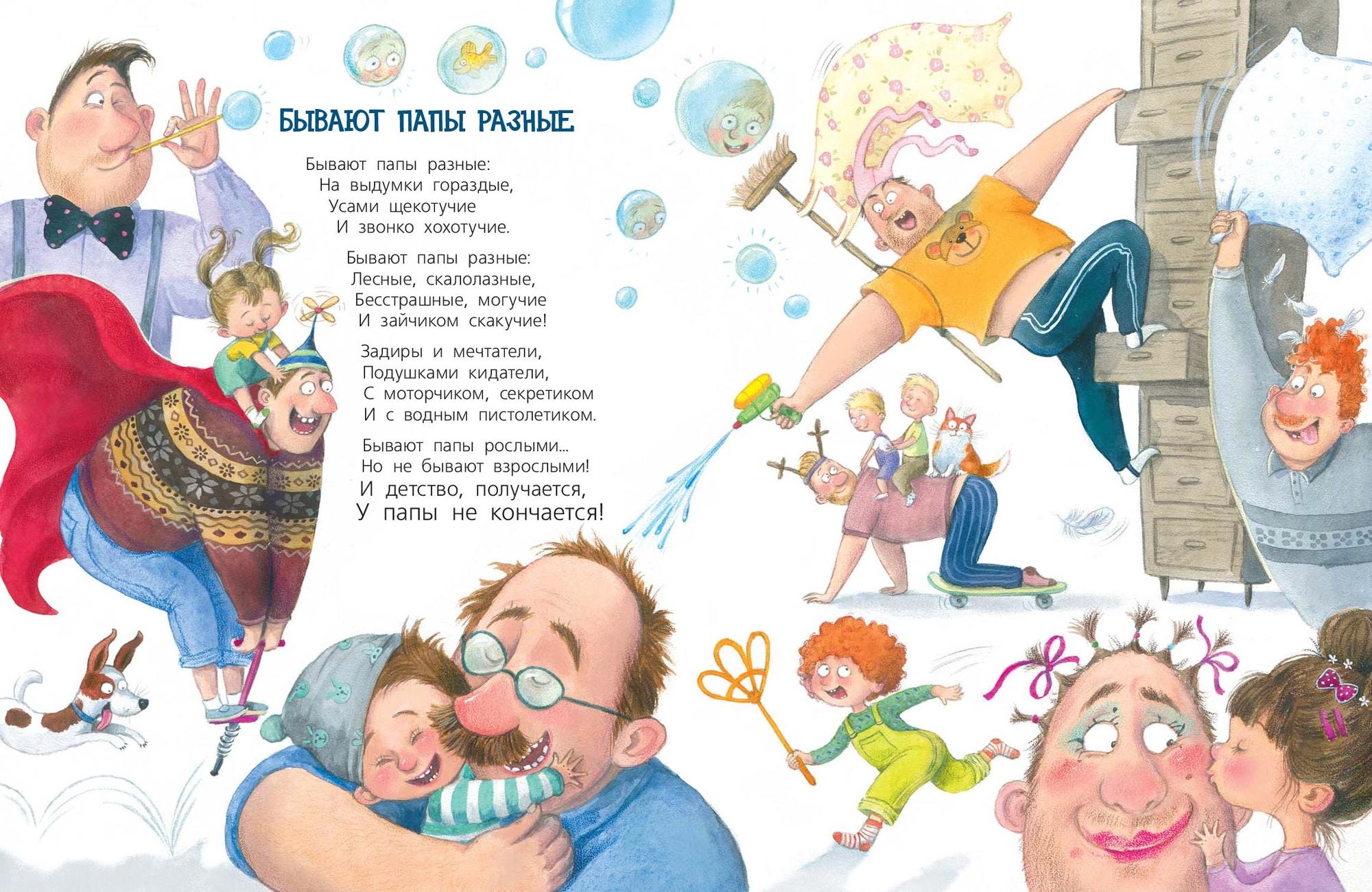 Папа – самый сильный, самый умный и самый большой в мире ребёнок. Ведь детство у пап не кончается никогда! С ними так весело: можно легко превращаться в разведчиков или альпинистов, мчаться по лесу на мопеде и отправляться в удивительные походы на байдарке... Забавные, озорные, а порой очень нежные стихи Ксении Валаханович, посвященные папам, оживают в иллюстрациях Любови Ерёминой-Ношин.