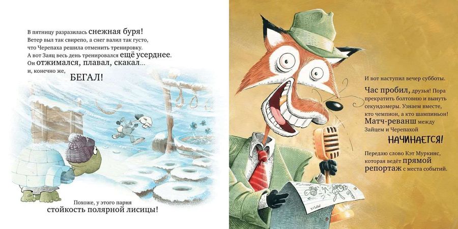 Вы с малышом станете свидетелем матча-реванша между чемпионом Черри «Шевелись Уже» Черепахой с фирменным стилем «Тише едешь, дальше будешь» и Гарри «Ураганом» Зайцем, которого отличает «Прыть и натиск». Целую неделю герои готовятся к битве, встречая массу препятствий на своем пути. И вот день X настает. Кто же станет победителем? И удастся ли Зайцу отобрать у Черепахи чемпионский титул? Об этом вы узнаете только в конце книги «Черепаха и Заяц: матч-реванш!». А потом вместе с уставшим от такой нервотрепки, ведущим Джонни Лисом, отправитесь спать.
