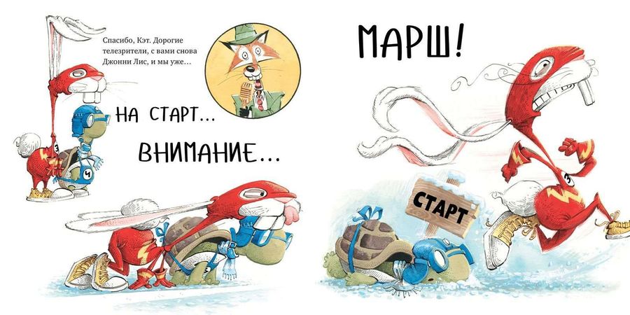 «Добрый вечер, дорогие любители спорта! С вами Джонни Лис, и это „Большие гонки“ в прямом эфире! Мы ведем вещание с Дома-на-дереве. Сегодня нас ждет самое грандиозное состязание в истории леса — не ошибусь, если назову его событием года. Заяц против Черепахи — МАТЧ-РЕВАНШ!».