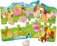 - Игровые атрибуты представлены 8 красочными пазловыми деталями для сборки картинки с изображением разнообразных животных и маленькими фигурками их детенышей.