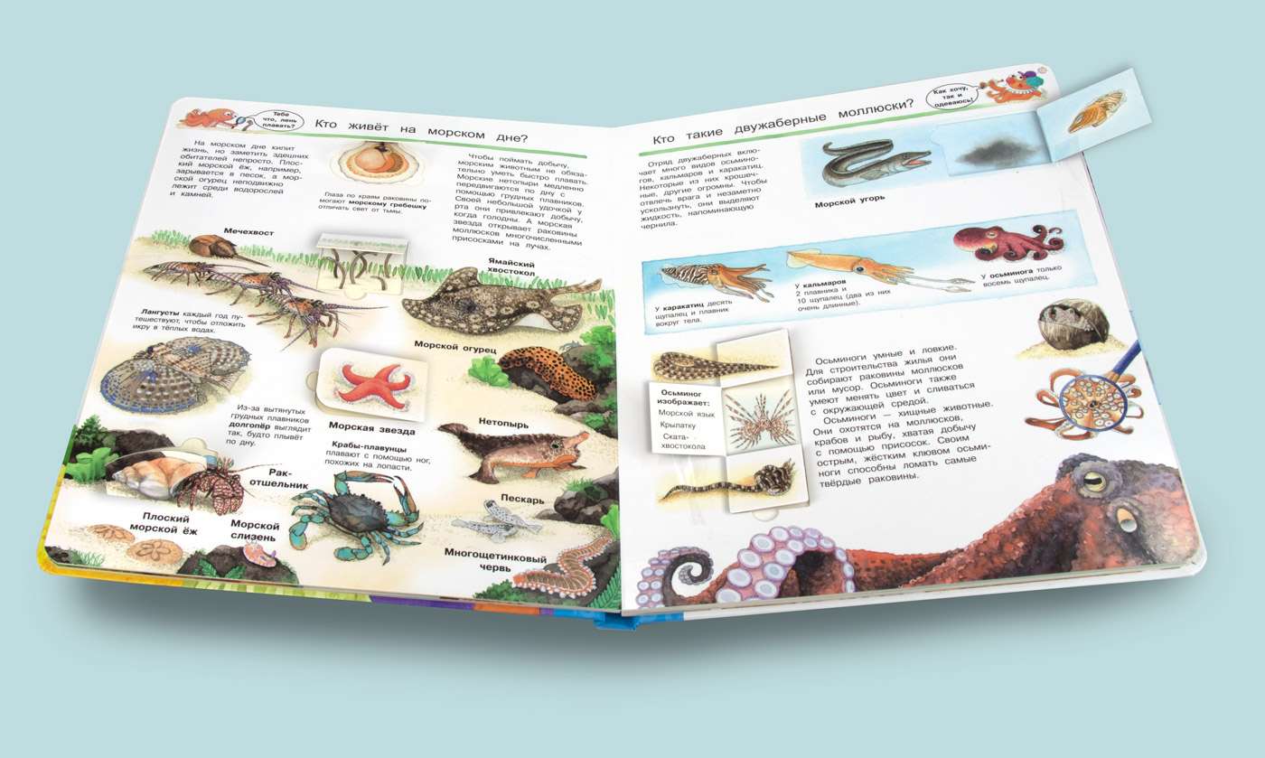 Каждый книжный разворот энциклопедии насыщен массой интереснейшей информации, красочно и занимательно описывающей жизнь морских животных. Здесь можно найти простые и понятные ответы на вопросы: какие животные обитают в морях, чем они питаются, как охотятся и как защищаются, кто живёт на морском дне и кто такие двужаберные моллюски, какие морские обитатели самые большие, а какие самые умные, как появляются коралловые рифы и кто живёт на большой глубине.
