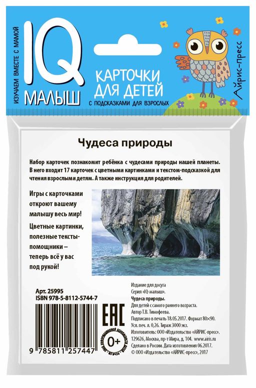 Игры с карточками не просто знакомят малыша с нашим удивительным миром, они развивают память, зрительное и слуховое восприятие, расширяют словарный запас, формируют интеллект. С помощью этого набора двусторонних карточек ребёнок познакомится с природными чудесами нашей планеты. В комплект входит 17 карточек с цветными картинками и текстом-подсказкой на обороте для чтения взрослыми детям.