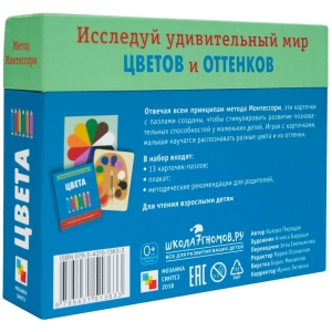 В компактной красочной коробке есть все необходимое для занятий: 13 карточек из плотного картона с основными цветами, разделенными на оттенки, а также изображениями цветовой палитры и различных предметов, а также большой постер с цветовым колесом, который можно использовать для классификации и сравнения предметов.