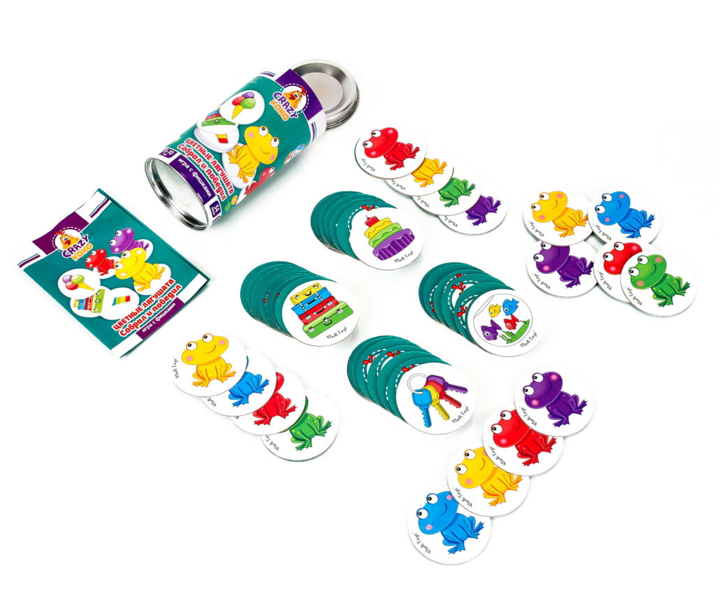 - Игра представлена фишками с разноцветными лягушатами и фишками с заданиями.