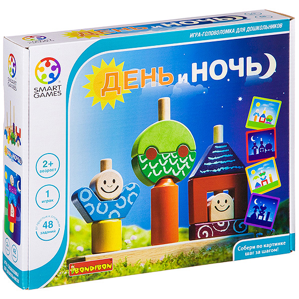Красочная игра для малышей "День и ночь" - это яркие и необычные, приятные на ощупь деревянные детали конструктора-головоломки для детей от двух лет.