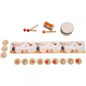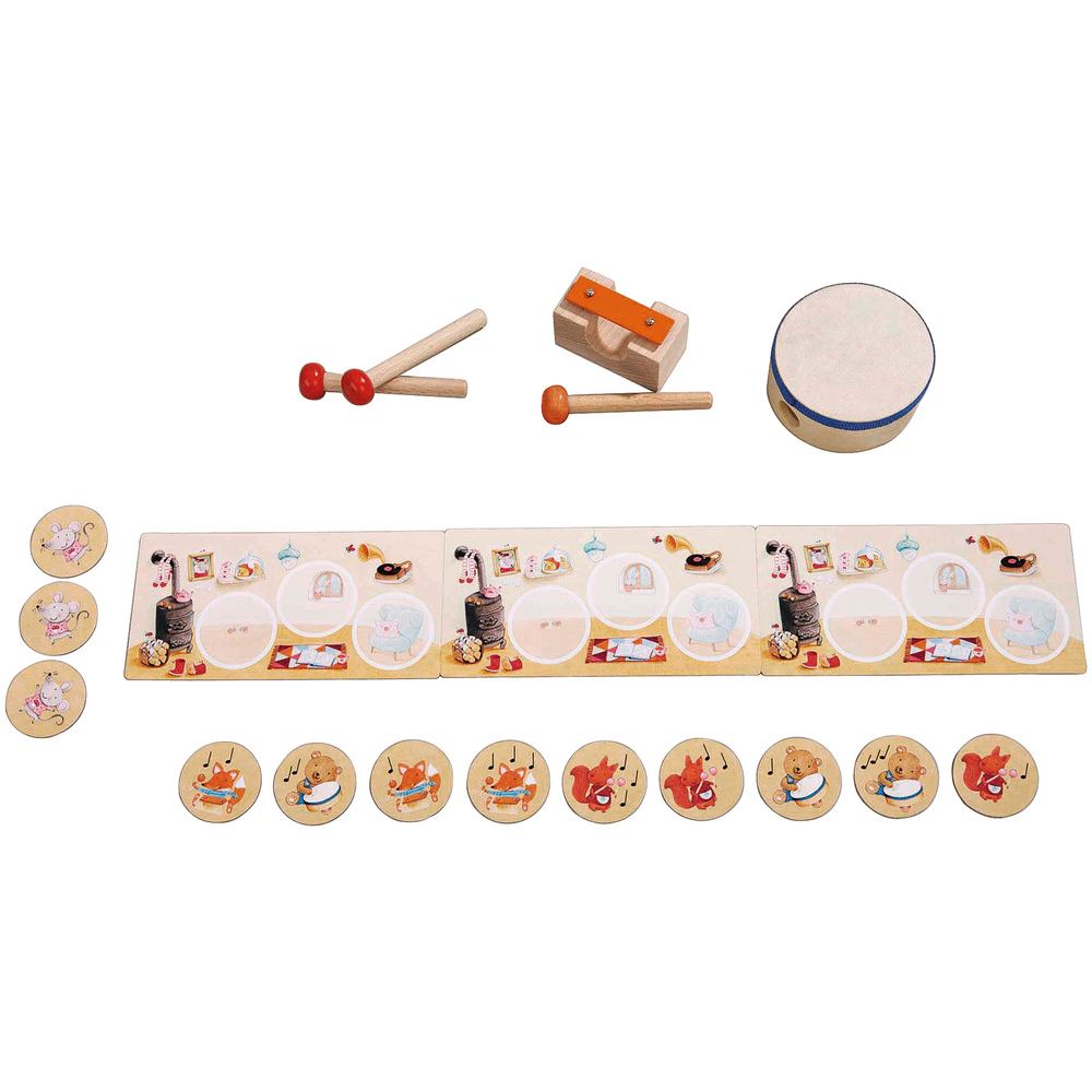 Комплектация: 1 Мама мышка, 1 бубен, 1 металофон и молоточек, 1 пара ударных палочек, 1 игровое поле, 3 лесные мыши, 3 кубика мышки Миа, 9 кубиков животных, 3 домика мышки, 1 цветнок кубик, инструкция
