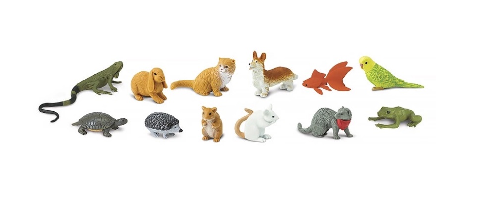 Набор из 12 фигурок самых популярных домашних питомцев: игуана, черепаха, еж, хомяк, золотая рыбка, лягушка, кошка, хорек, корги, попугай, мышь и кролик. Размер фигурок варьируется от 4 до 7,5 см. Возраст: 3+