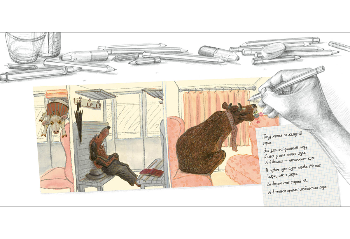 Художница рисует длинный-длинный поезд, в котором едет много разных зверей, и среди них - любопытная маленькая свинка по имени Джоанна. В этом необычном путешествии Джоанна спорит с Художницей, всему удивляется и хочет найти себе друга?