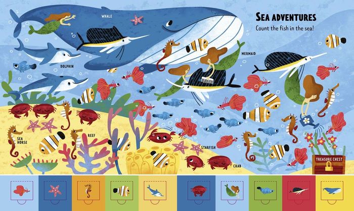 Каждый разворот — большая сюжетная иллюстрация! Вас ждет солнечный пикник, шумный зоопарк, лесные прятки и морские приключения! Сосчитайте все новогодние подарки, помогите обезьянке и пиратам уплыть с далекого острова, посетите магазин игрушек и сосчитайте все, что только увидите! Веселые окошки-клапаны превратят обучение в увлекательную игру.
