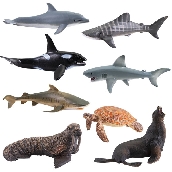 В ассортименте 8 фигурок: Касатка, Дельфин, Белая акула, Китовая акула,Тигровая акула, Морж, Котик, Черепаха.