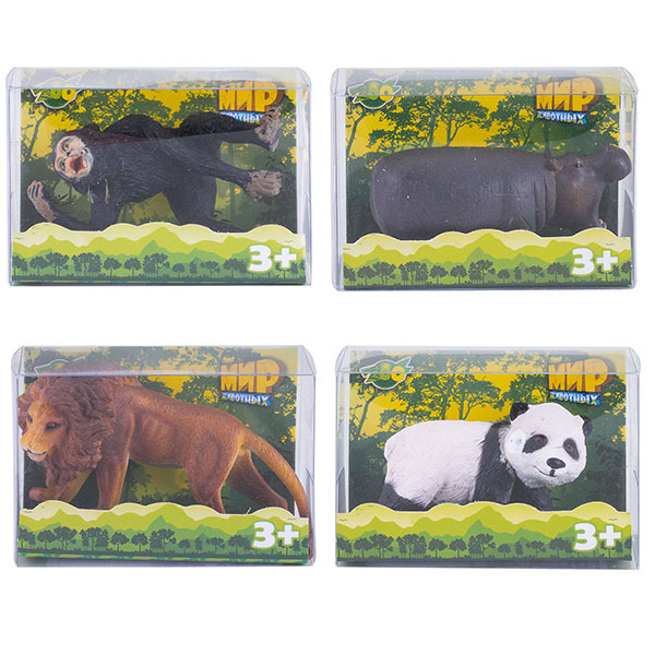 В ассортименте 12 фигурок, в том числе бегемот, слон, обезьяна, белка, медведь, панда, тигр, лев.