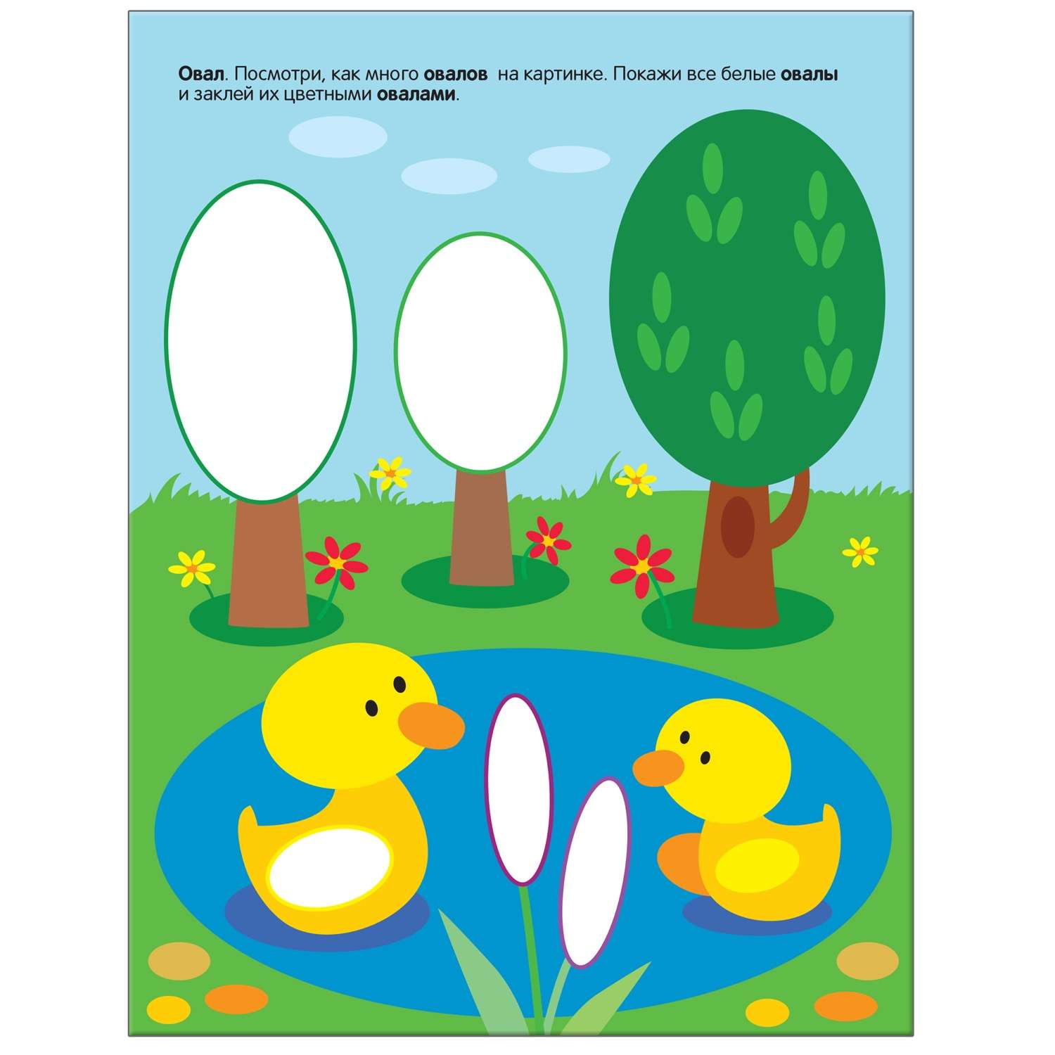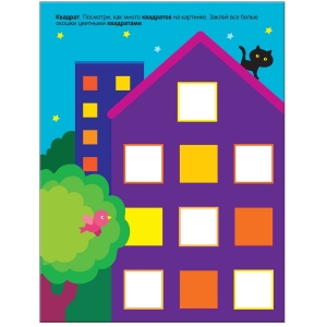 С помощью этой книги малыш познакомится с основными геометрическими формами, научится различать и называть их (в домик нужно наклеить квадратные окошки; возле озера с утятами – овальные кроны деревьев и камыш и т. д.).
