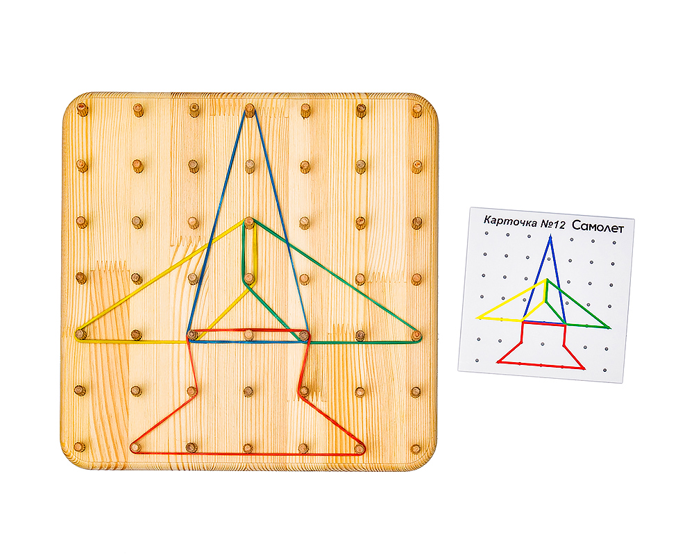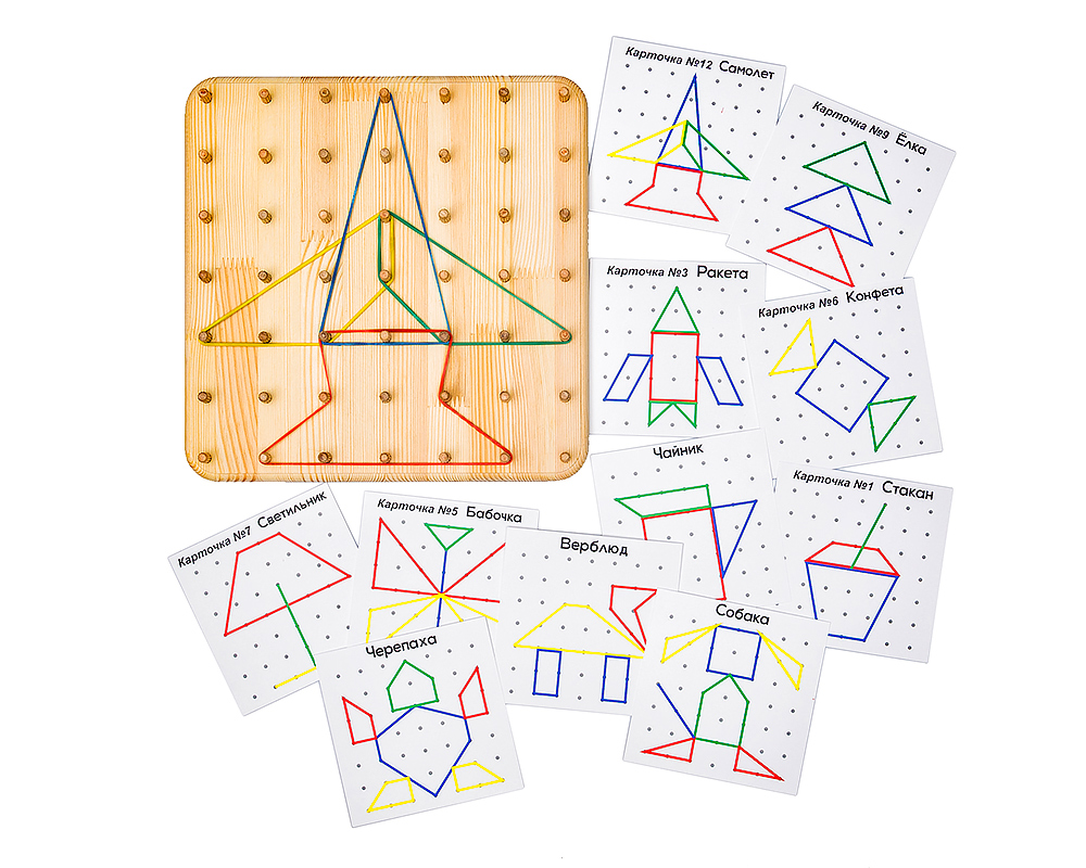 2. Рисование по образцу. Предложите ребенку выбрать одну из карточек (кораблик, елка, цветок…) и попросите повторить рисунок на геоборде с помощью резинок.