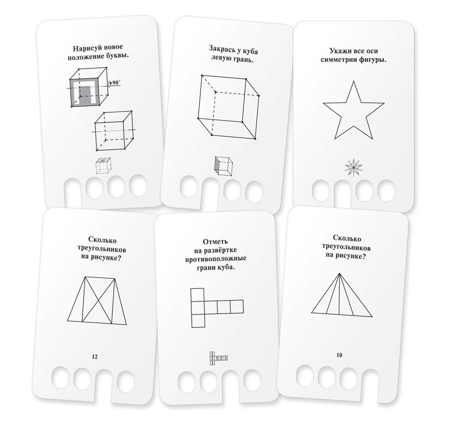 Во второй игре ребёнок будет отвечать на вопросы, рисовать, развивая пространственное мышление, закрашивать или дорисовывать грани фигур, определять оси симметрии и т. п. Ответ вписывается карандашом, затем можно вытянуть карточку из блока и проверить себя, сверяя свой ответ с правильным.