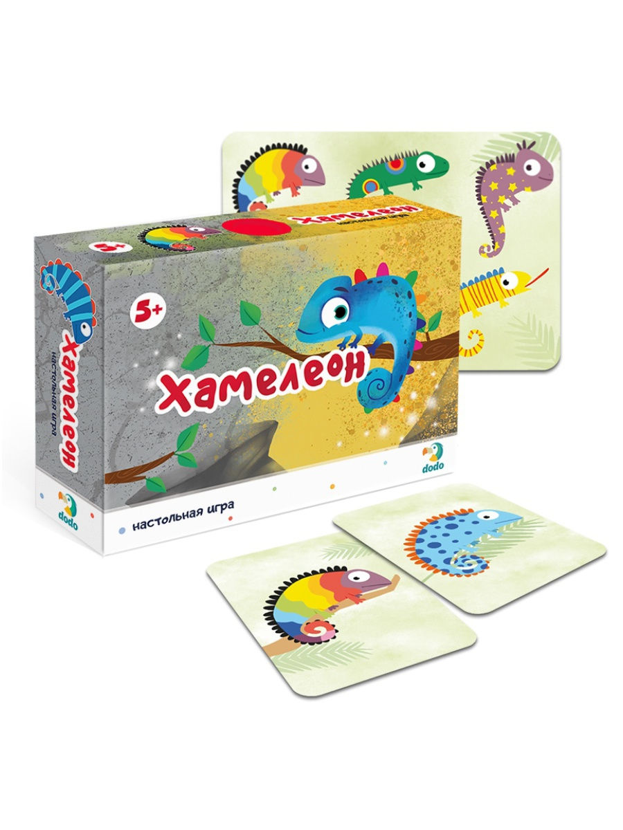 Настольная игра на внимание Хамелеон состоит из 8 игровых полей, на которых нарисовано по шесть ящериц разного цвета, и 32 карточек с изображением этих же пресмыкающихся.