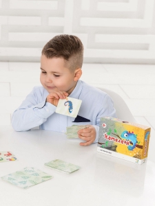 Ребенок выбирает одно из игровых полей и старается запомнить всех хамелеонов, что на нем изображены, а затем среди всех карточек ищет именно своих ящериц.