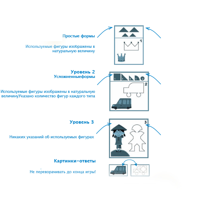Набор состоит из шаблонов, на которые ребенок должен наложить отдельные части (фигуры). Главная задача – правильно скомпоновать детали. Двусторонние карточки имеют три уровня. На маленьких карточках есть подсказки для ребенка - каким образом нужно собирать фигуры вместе.