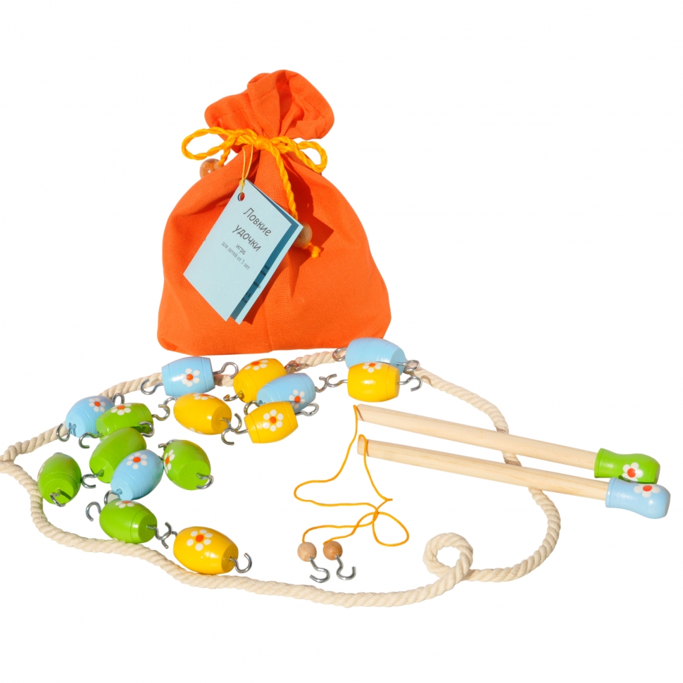 Кроме удочек в состав игры входят "деревянные рыбки" - это как раз различные фигурки в форме домика, бочонка и желудя. Они изготовлены из высококачественной древесины и окрашены вручную безопасными красками на водной основе. Каждая фигурка имеет два крючочка, которые легко зацепляются друг за друга. Эти крючки не позволяют подцепленному элементу соскочить.