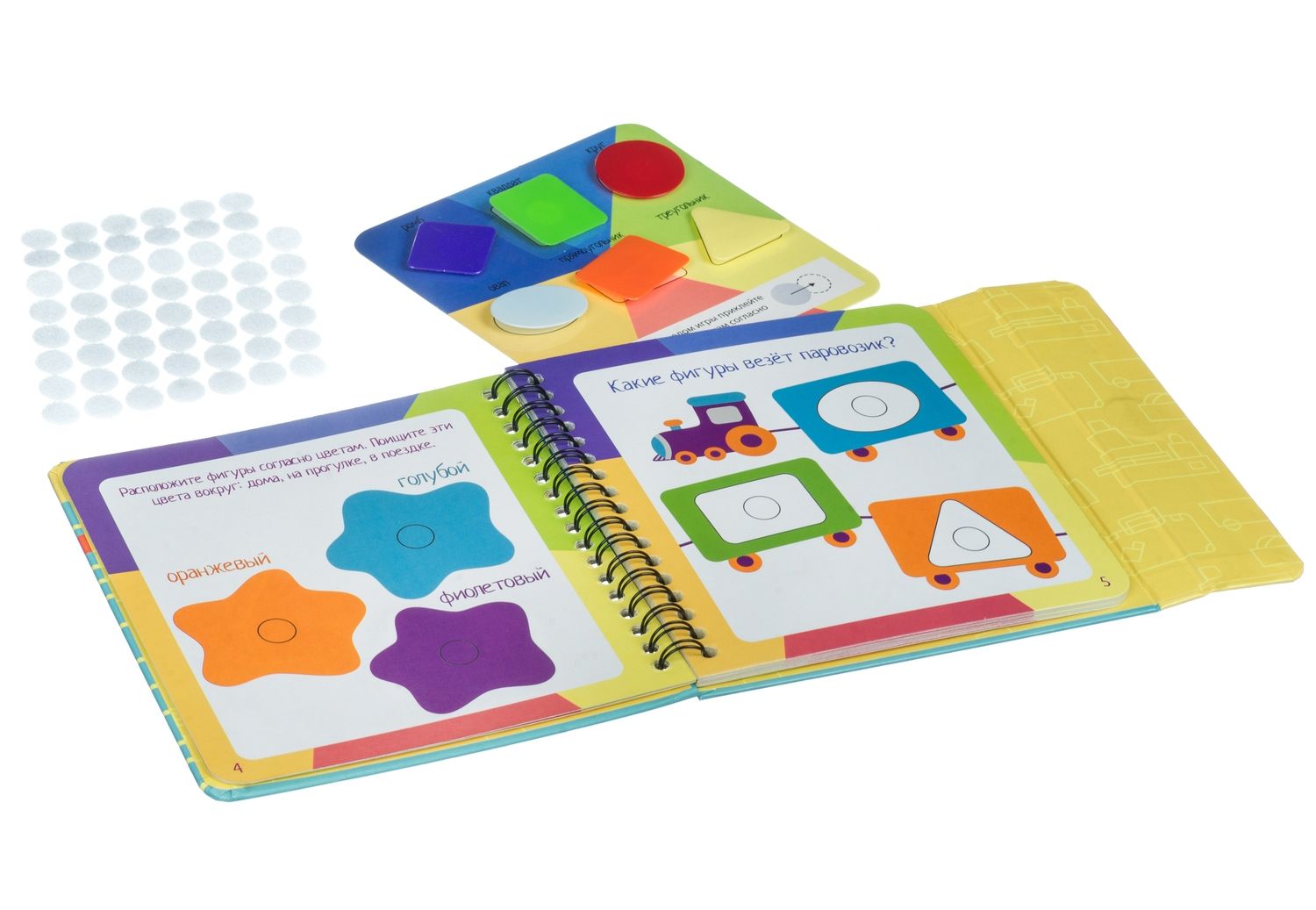 В наборе липучки, которые помогут малышу изучить цвета и формы.