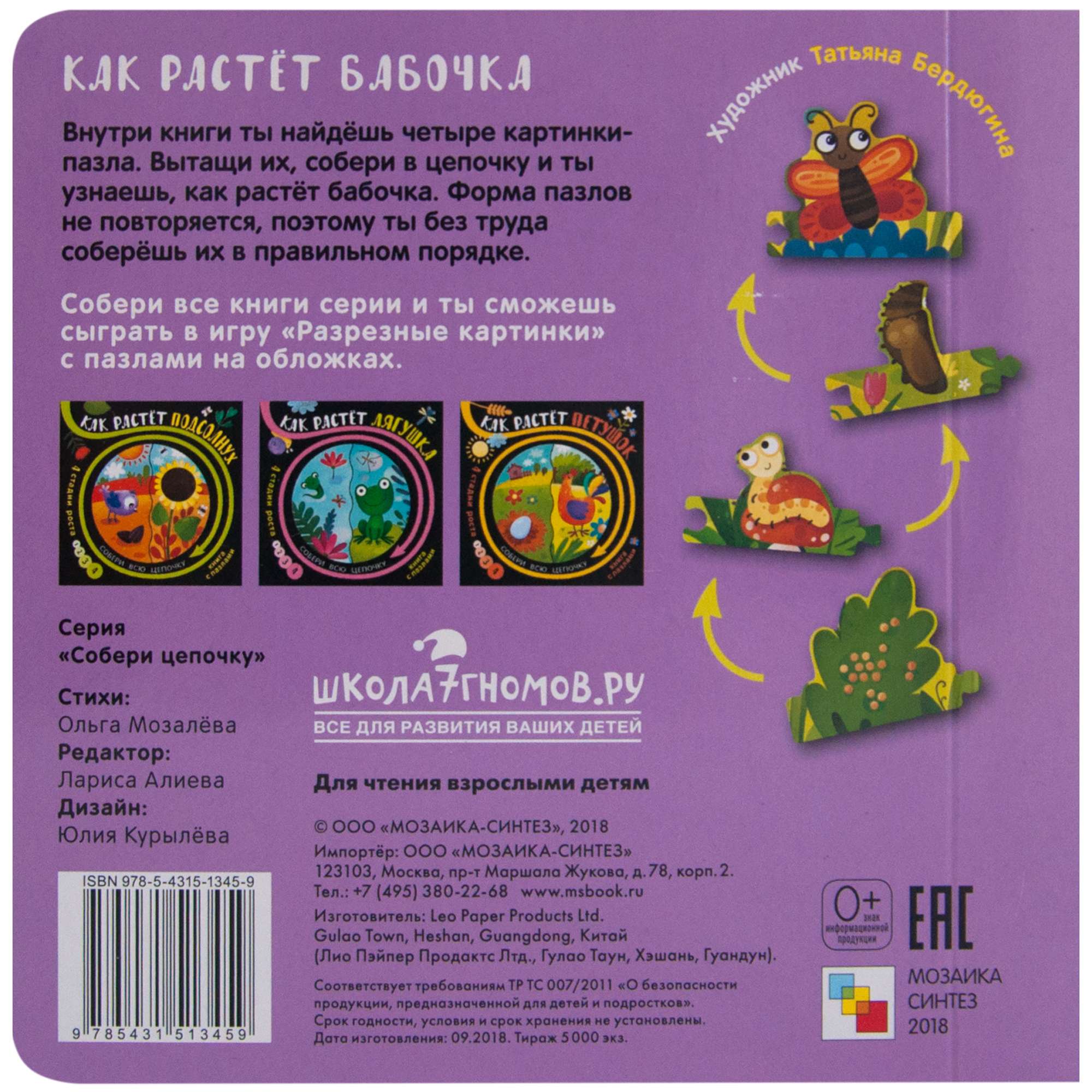 Книга с пазлами «Как растет бабочка» из серии «Собери цепочку» познакомит ребенка со стадиями роста прекрасной бабочки.