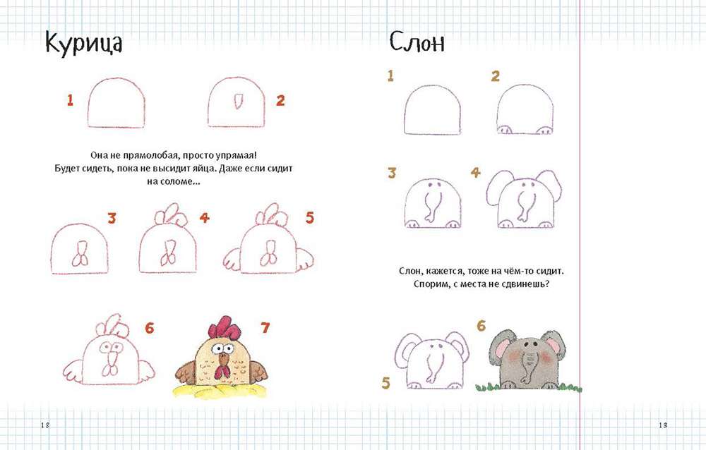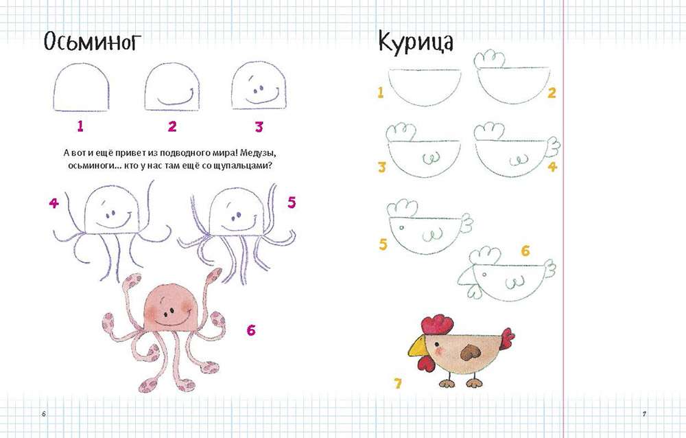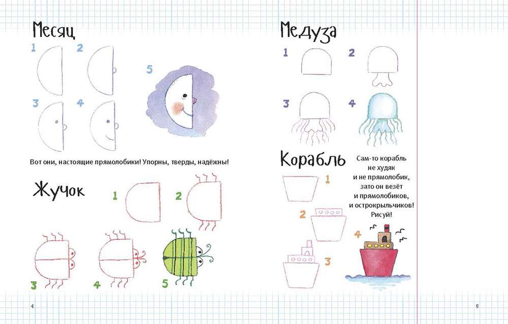 Если буйная фантазия не дает рукам спокойно держать карандаш, а в голове ещё держатся образы простых угловатых фигур - квадратов, прямоугольников, треугольников, трапеций, - то всю эту геометрию легко оживить с помощью нашей волшебной книжки. Было бы желание и немного места на полях тетрадки!