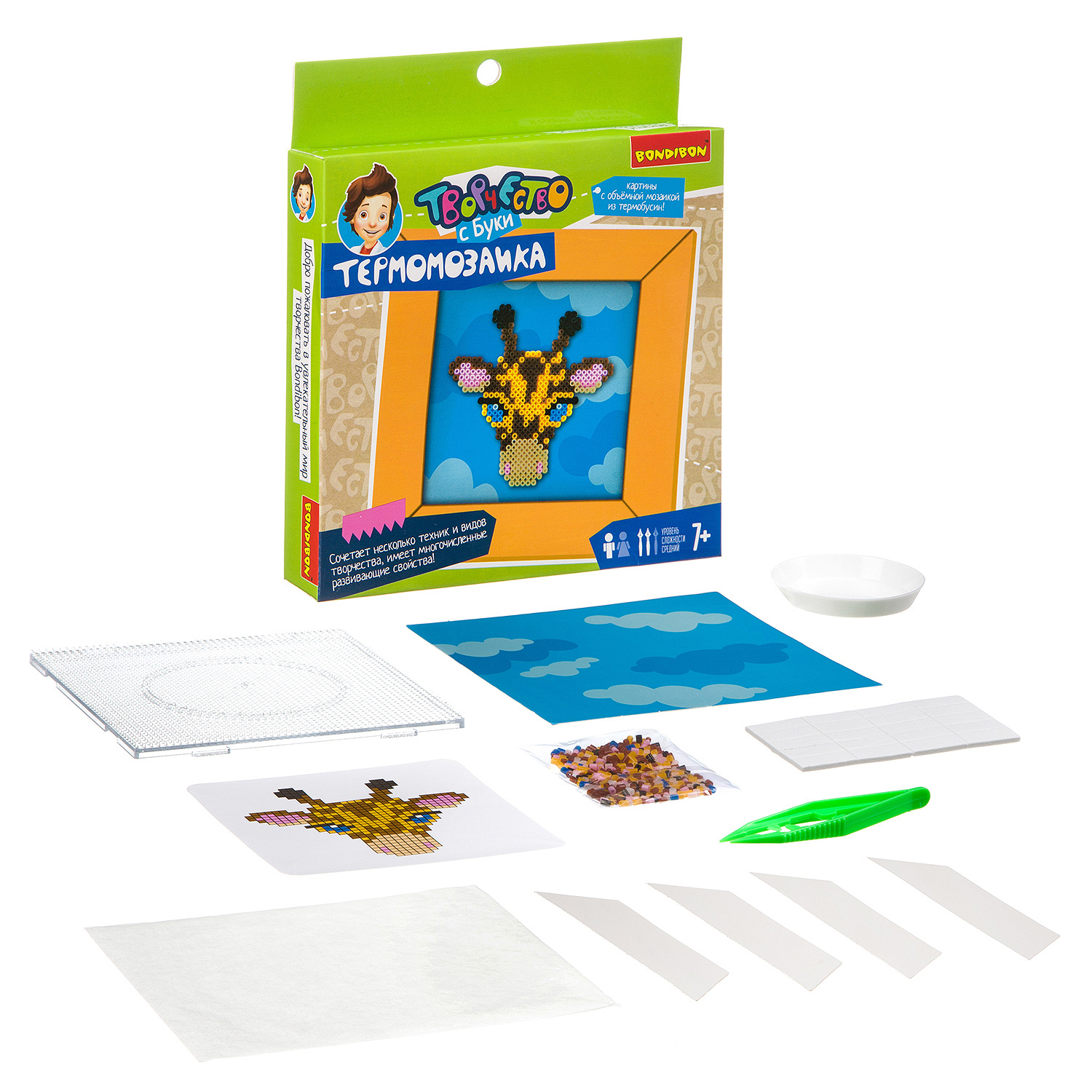 В наборекартонная основа для картины, детали для создания рамки, двусторонний скотч, детали термомозаики, емкость для деталей, трафарет-иллюстрация, планшет для выкладывания термобусин, калька для проглаживания деталей, пинцет.