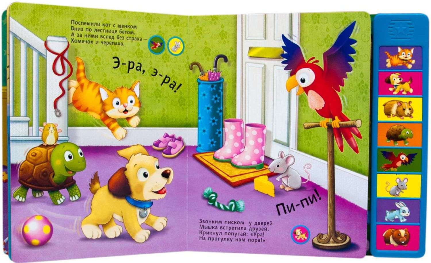 Замечательная звуковая книжка «Домашние питомцы» обязательно понравится Вашему малышу. Добрые стихи расскажут ему о веселой игре озорного котенка и его друзей.