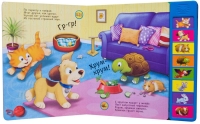 Нажимая на кнопки, ребенок сможет послушать 8 разных звуков: мяуканье котенка, лай щенка, крик попугая и другие голоса домашних питомцев.