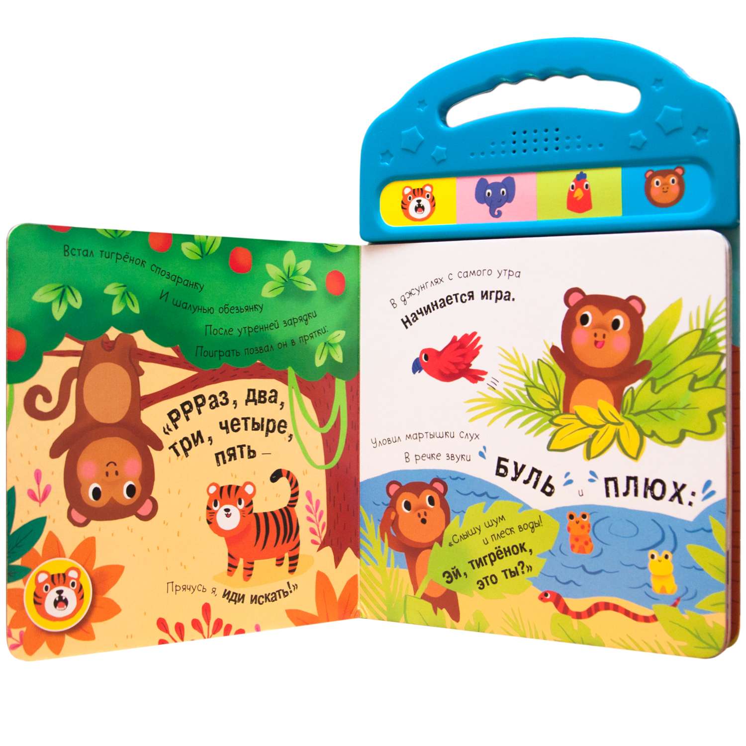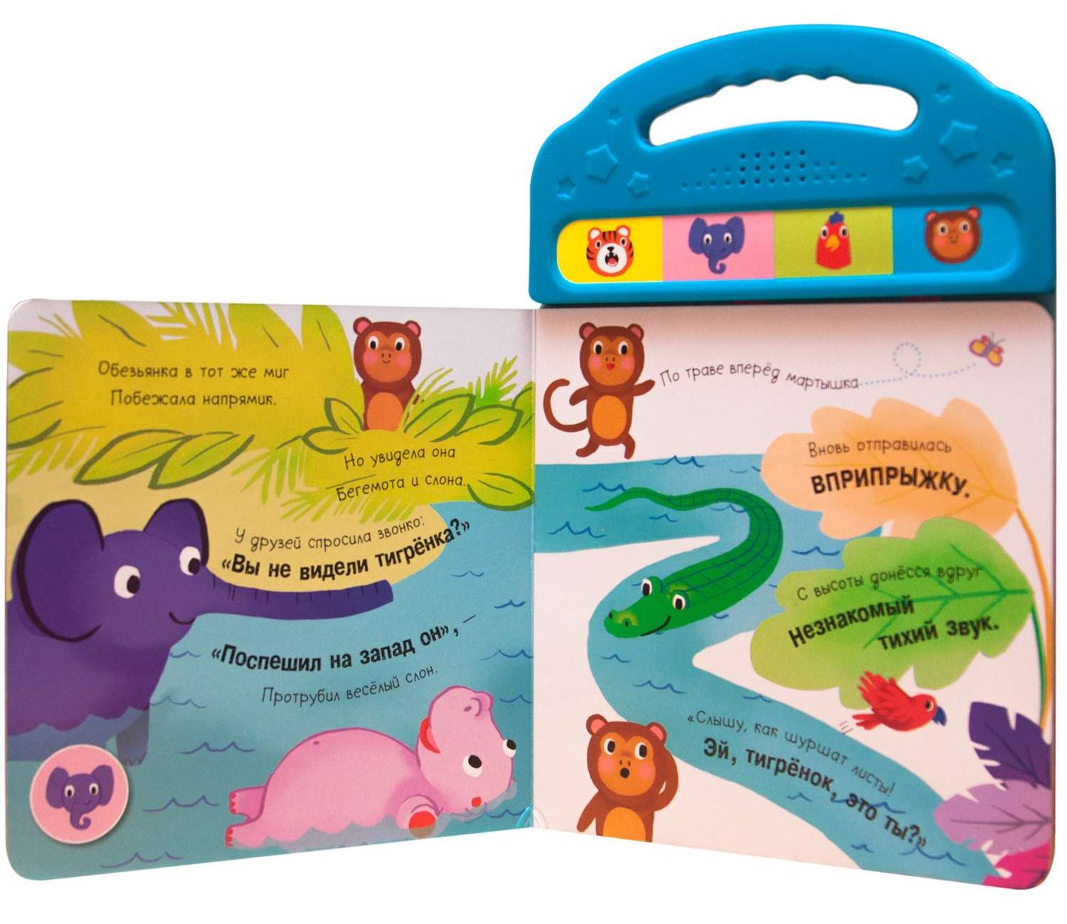 Р-р-р! Отправляйтесь в джунгли и поиграйте в веселые прятки вместе с тигренком, обезьянкой, слоном и попугаем. Нажимайте на кнопки и слушайте звуки джунглей!